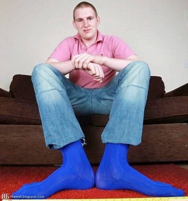 The 19-year-old, who stands at 6ft 8in, has feet that are a staggering 14.5in long - or a size 21. The UK average men's shoe size is a nine.
