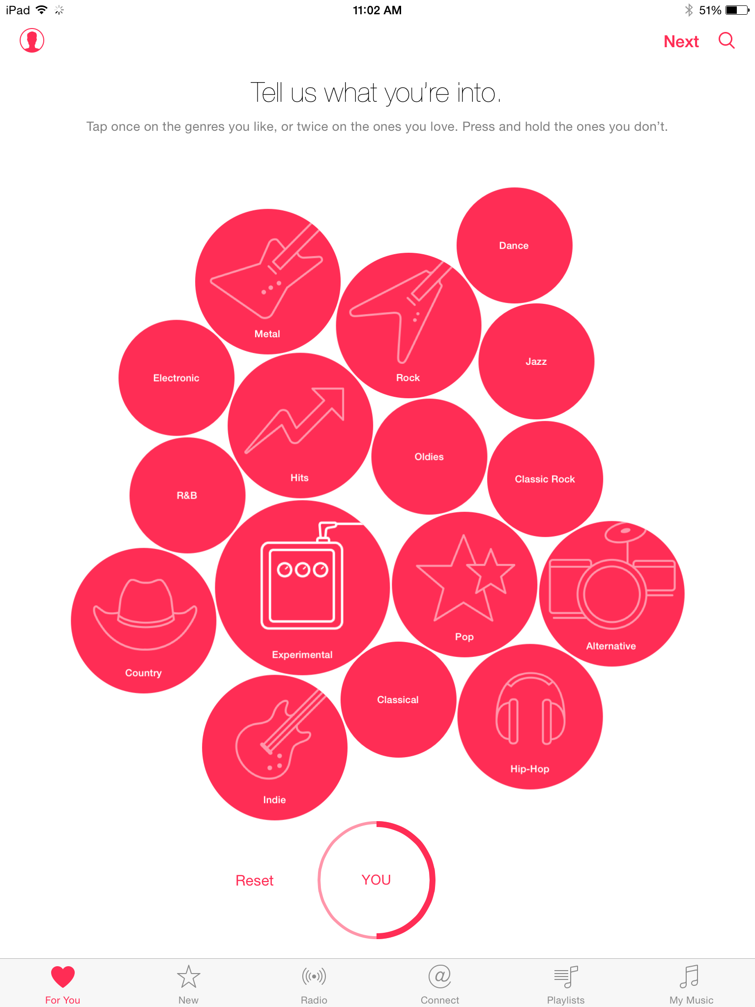 Upon my first load of the app, I tapped the giant heart in the toolbar that reads "For You," and I immediately became frustrated. "Tell us what you're into," it beckoned, but I couldn't type out individual artists. Instead, I had to vote for genres floating around the screen as little bubbles. Tap a genre's bubble if I like it, double-tap a genre that I love, and press-and-hold any genre I dislike.